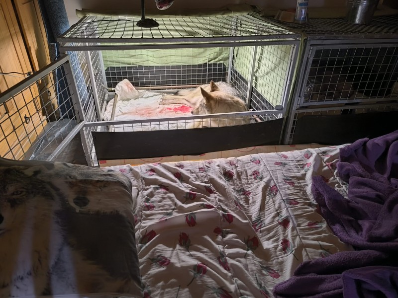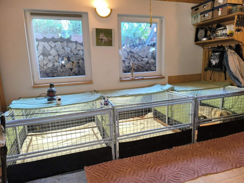Do chodby přineseme porodní boxy, které jsou v současnosti skládací klece. Za celou dobu, kdy odchovávám štěňata, jsem používala mnoho typů porodních boxů a poroden. Každý rok jsem se snažila tyto boxy upravit k dokonalosti, aby byly vyhovující pro matky i pro mě. Tedy jsem nakonec skončila u klecí, které mají zvýšený práh, aby nám štěňata neodcházela ven, jsou skládací, aby po použití zabraly minimum místa a také velikost se ustálila na takové, aby se mi do chodby vešly tři vedle sebe. A proč vlastně klece? Ne vždy jsou v porodnici feny, které se navzájem znají. A aby byla každá se svými štěňaty v bezpečí a měla soukromí, jsou klece zavírací a bezpečné. Budoucí matky štěňat jsou v porodnách už několik dní dopředu, aby se zabydlely a každá věděla, která porodna je momentálně její. Těsně před porodem se celá chodba i porodny znovu vydesinfikují, zapnou se světla, zprovozní se kamery a vše se připraví na nadcházející porod(y).