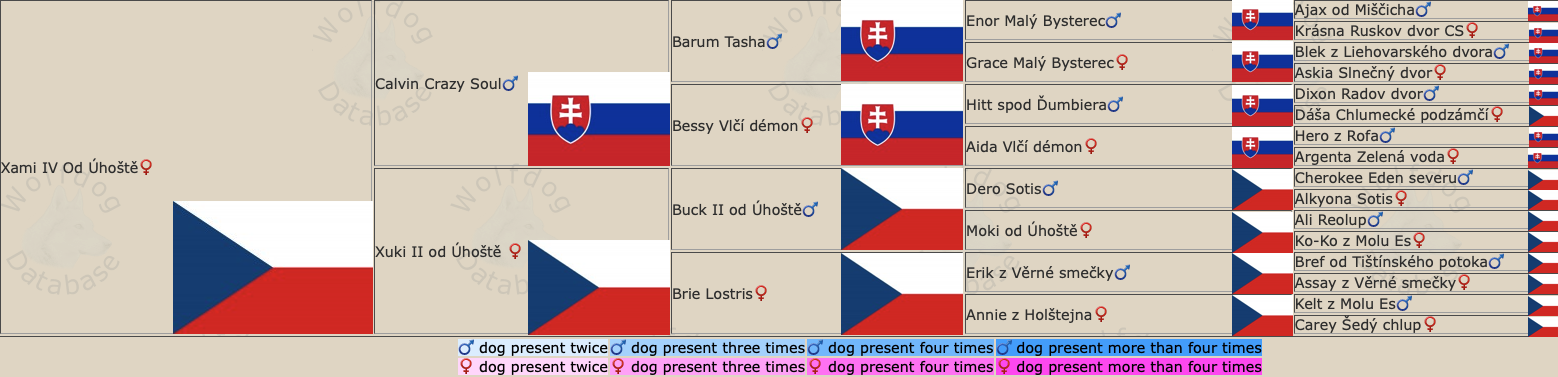 Xami je jedna z několika velmi hodnotných fen v mém chovu. Její rodokmen je od roku 1958 čistě česko/slovenský. Jen jen několik československých vlčáků na celém světě, kteří mají takovýto rodokmen. Navíc je její příbuznost v celém jejím rodokmenu jen minimální. Tedy očekávám, že její štěňata budou zdravá a nezatížená genetickými chorobami. Její rodokmen je téměř ideálně rozdělený na českou a slovenskou polovinu. Takže u této fenky se čistě teoreticky může projevit heterózní efekt, protože česká a slovenská populace byla po dlouhou dobu oddělená. Xami podědila nádhernou delší srst, která se nám z populace velmi rychle vytrácí, navíc má pěkné syté barvy. Její velkou předností je její hlava. Velká, široká, s malýma trojúhelníkovýma ušima. Xami je velmi temperamentní a přátelská fenka. Jsem si jistá, že bude nejen pro český chov velkým přínosem.